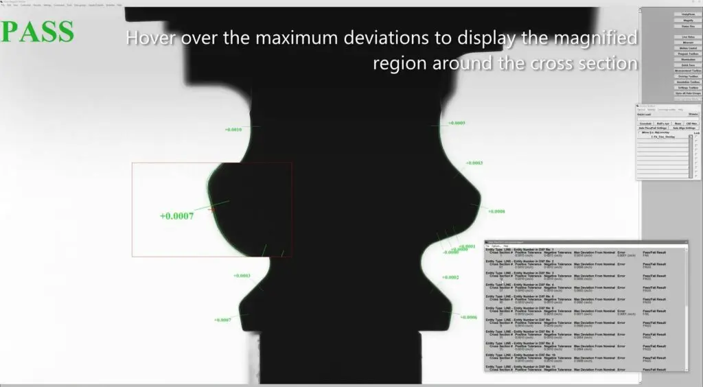 The VisionGauge® Digital Optical Comparator’s CAD Auto Pass/Fail™ tool computes and displays, in real time, the part’s deviation from nominal for automatic Pass/Fail results.
